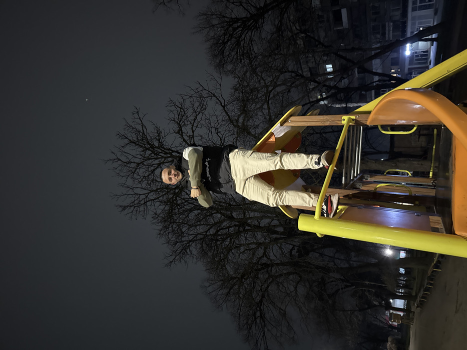 This nighttime image depicts an adult male standing on a yellow and orange playground structure in Cherven Bryag, Bulgaria