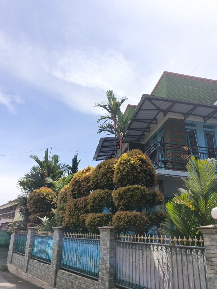 A two-story house with a green roof and blue siding is visible behind a row of sculpted, rounded bushes with orange tips. A palm tree stands between the bushes and the house. A blue fence with gray brick columns runs along the front of the property. The sky is partially cloudy with a blue hue.