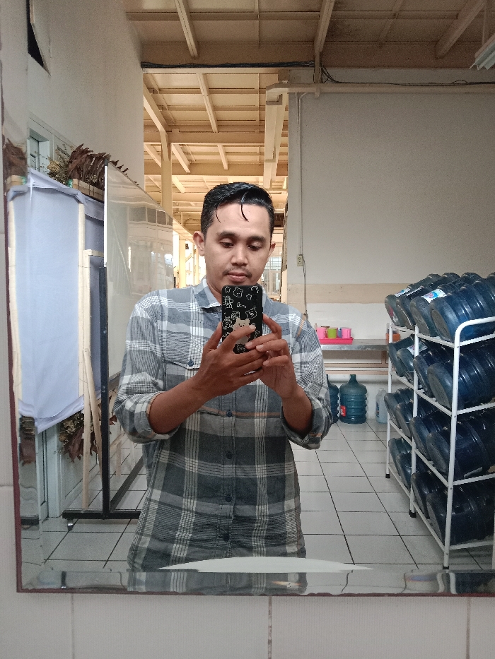 A man takes a mirror selfie in what appears to be a utility area. He wears a gray plaid shirt. Behind him are rows of water jugs on metal shelves and a large blue water bottle. A building structure is visible through a doorway, likely an industrial or commercial space. The reflection captures the tiled floor and a piece of paper on the mirror frame. The man's phone case is decorated with cartoon figures.