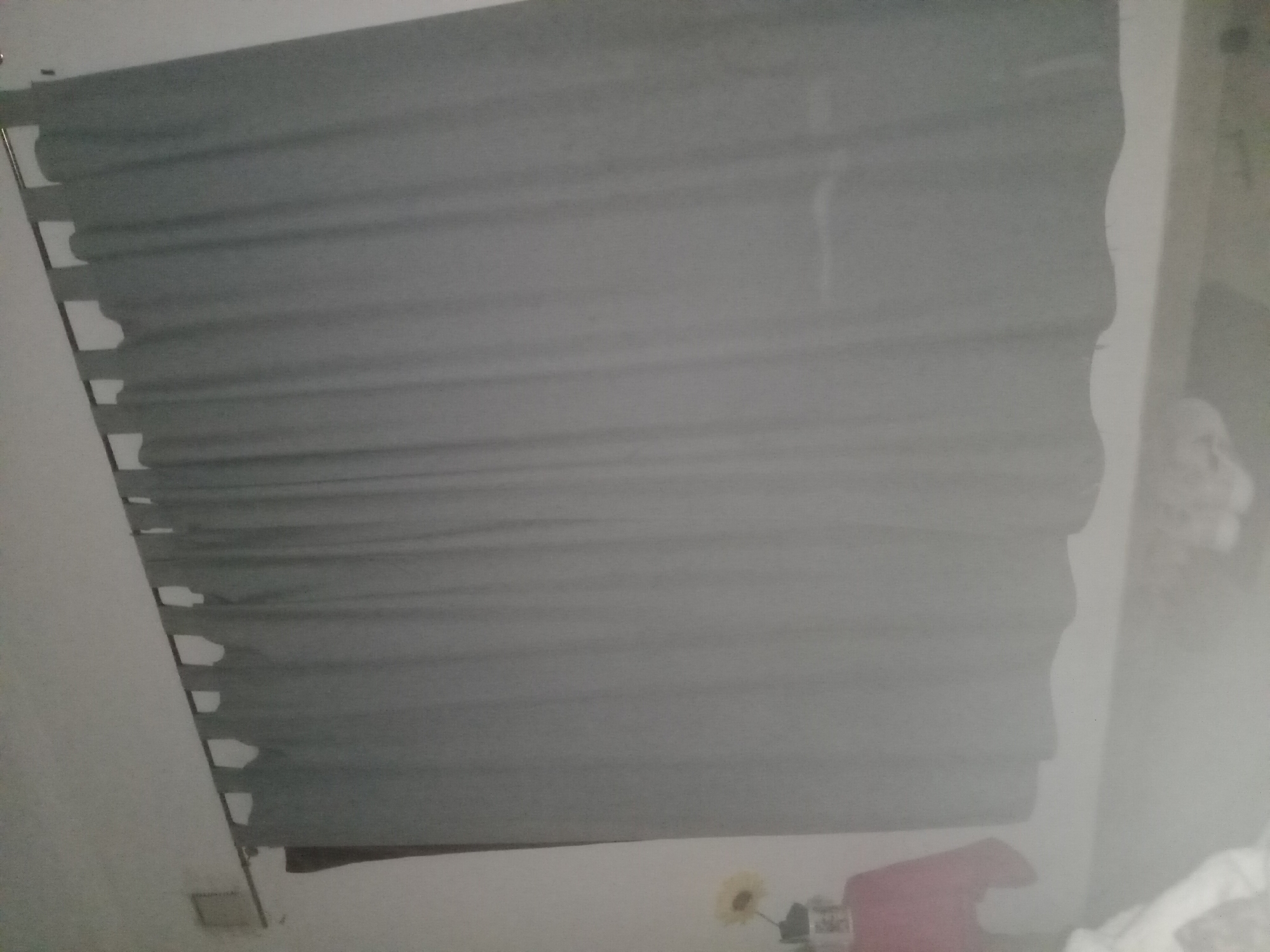 gray fabric window shade hanging in a room. The shade has a series of evenly spaced slits along its left side, likely for a pull cord or attachment mechanism. The wall is white, and there is a hint of a room's interior below the bottom edge of the shade. Faintly visible are hints of a floral decoration, a pink item, and some white soft materials (possibly blankets or clothing), all of which sit on a flat surface. Details are insufficient to locate the exact address within Villa Ballester Noroeste, Argentina. No people are visible. The environment is indoors, suggesting residential or domestic use. The objects include a window shade, wall, and hints of domestic items. The actions are implicit; the shade is hanging and possibly designed to control light or privacy. Interactions are not directly observable.