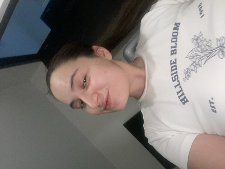 A woman with long brown hair pulled back smiles slightly at the camera. She wears a white t-shirt with a floral design and the words "HILLSIDE BLOOM EST. 1998" printed on it in blue. The background is dark and suggests an indoor setting, possibly a room with a television screen visible in the upper left corner. The image is slightly rotated, giving it a casual, candid feel.