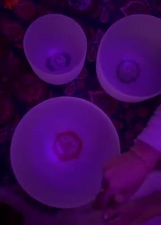 top-down view of three crystal singing bowls arranged on a patterned rug. Each bowl has a symbol at its center, which is lit by purple light. A person's hand enters the frame, holding a mallet and gently striking the rim of one of the bowls. A portion of their foot is visible in the lower right corner. The setting appears to be a dimly lit, possibly bohemian or spiritual space.