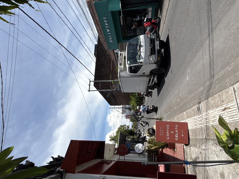 A street scene with a mix of buildings and vehicles. On the right, there is a sign indicating "Coffee & Gelato" alongside a shop. A white truck is parked on the street. Several motorbikes are visible. On the left, wires stretch across the sky. The sky is partly cloudy. The architecture includes both red-roofed structures and green awnings.