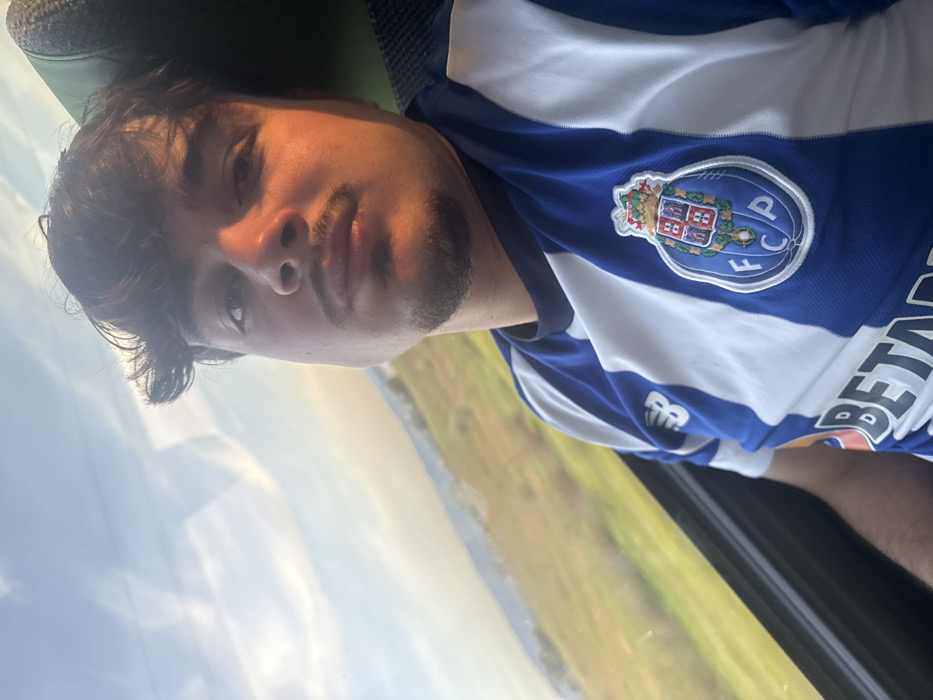 A young man with dark, curly hair and a trimmed beard poses for a selfie on a bus or train. He's wearing a blue and white striped soccer jersey with a team logo on the chest. Outside the window, a blurred landscape with hints of green fields and a body of water is visible under a bright sky. The light casts shadows on his face, highlighting his nose and cheekbones.