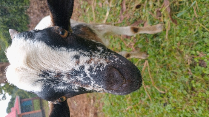- "An eye-level, close-up photograph depicts a domestic goat standing on green grass in Gesima ward, Kenya" by FM-76NYK2, licensed under CC BY 4.0