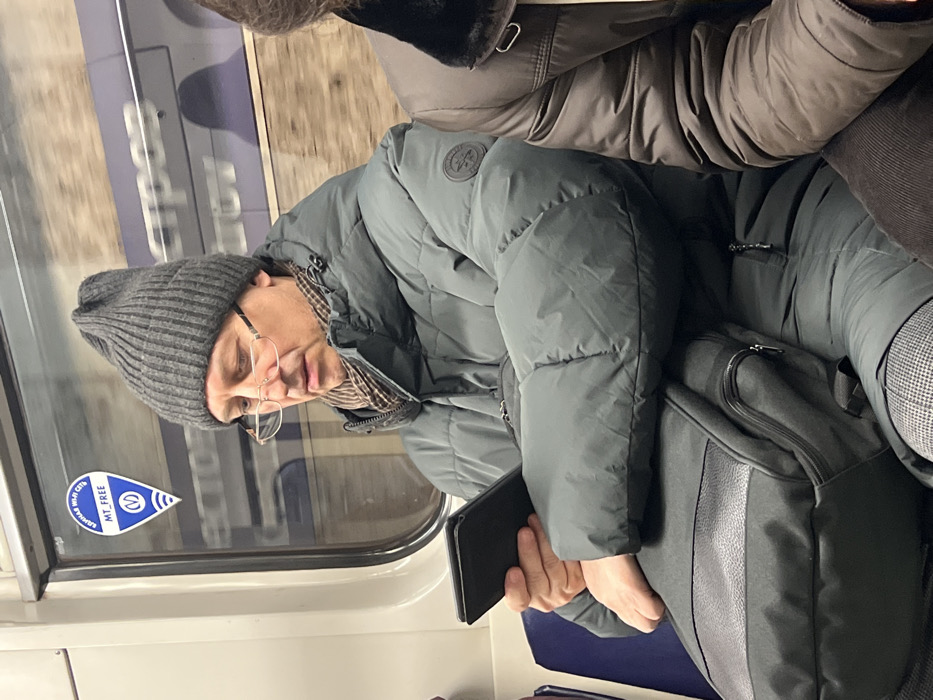 - "Inside a train, a person wearing a gray beanie, glasses, and a green puffer jacket is holding a black tablet" by FM-4Mf512, licensed under CC BY 4.0