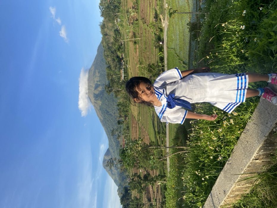 A young girl stands outdoors in Penanggungan, Indonesia, positioned slightly to the right of the frame, looking directly at the viewer with a slight smile