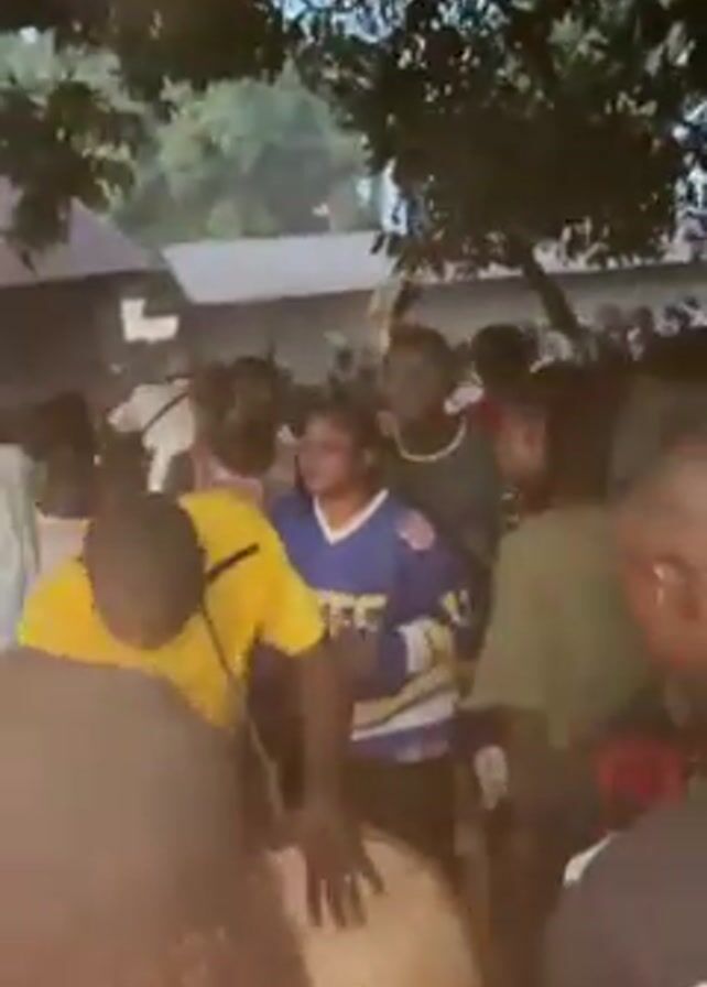 A crowd of people are gathered outdoors, some dancing to the beat of a large drum being played by a man in a yellow shirt