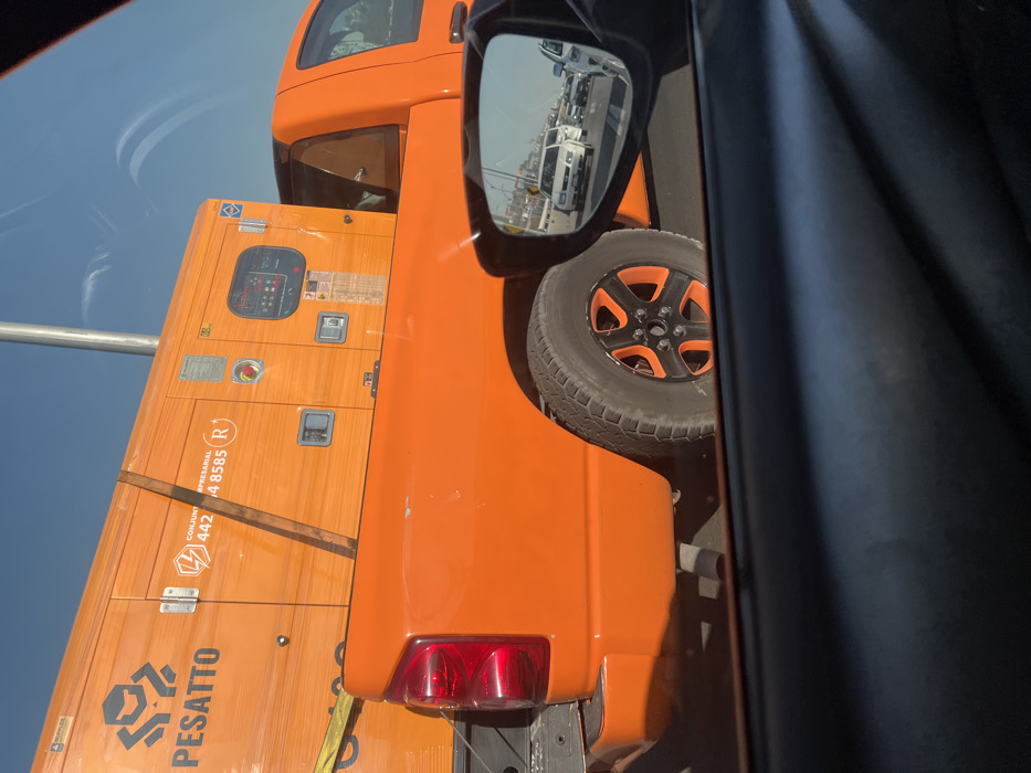 An orange truck carrying a large generator is viewed from another vehicle. The generator has a control panel and various decals, including "PESATTO" and a phone number. The truck's spare tire has an orange rim. The side mirror shows other trucks. The view is partially obstructed by the black interior of the observing vehicle.