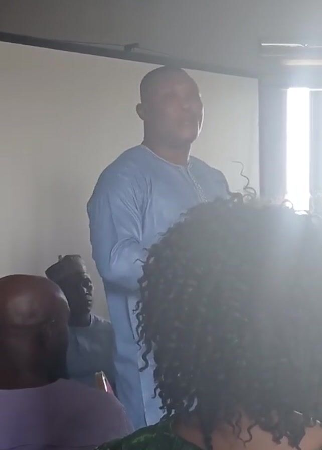 Here is a detailed description of the video: The video shows a man giving a speech or presentation to a group of people. The man is wearing a light blue long-sleeved shirt, and he is standing in front of the audience. The audience members are sitting in chairs and listening to the speaker. There are at least three other individuals visible in the foreground. The scene is well-lit, with natural light coming from a window. The background is a plain white wall. The camera angle is from the perspective of someone sitting in the audience.