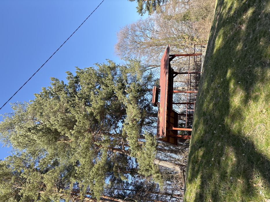 The image depicts an outdoor scene in Kostenets, Bulgaria, under a clear blue sky on a sunny day. A wooden gazebo with a reddish-brown tiled roof and a smaller decorative tier on its apex is centrally positioned on a grassy incline. The gazebo features visible wooden support beams and a dark railing enclosing its perimeter. To the left and behind the gazebo, numerous tall pine trees with green needles rise prominently. In the right background, bare deciduous trees are visible, indicating a season of leaflessness. The foreground consists of a green grassy slope marked by patches of sunlight and shadow. A single dark wire extends diagonally across the upper right portion of the sky. No individuals, actions, or interactions are depicted.