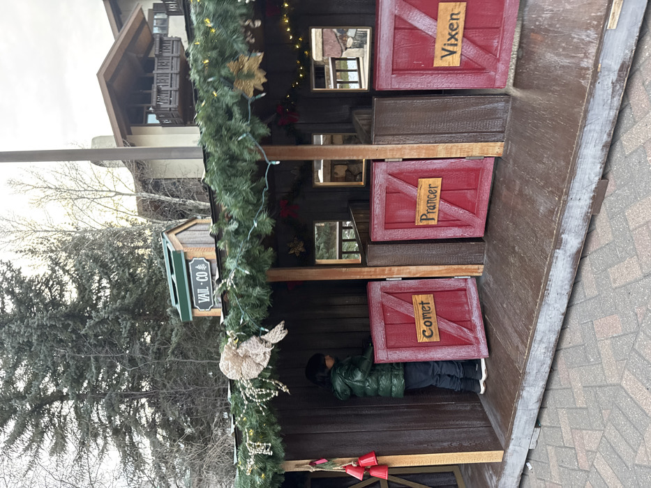 A child in a green jacket peers into a stall labeled "Comet" on a festive wooden structure. Above, doors are labeled "Prancer" and "Vixen". Garland with lights and a large bird adorns the side of the structure. A "Vail Co" sign hangs nearby. The structure has decorative mirrors above the doors. The backdrop features buildings and bare trees on an overcast day. The ground is paved with patterned bricks.