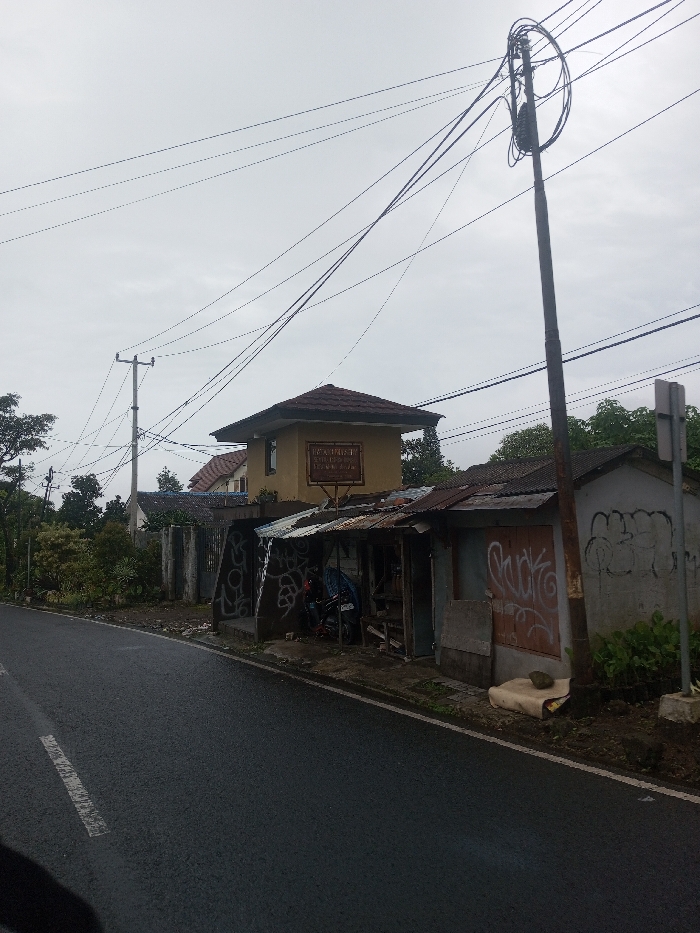 A street view under a cloudy sky reveals a stark contrast. A weathered roadside structure displays graffiti and a dilapidated roof, contrasting with an elevated, tan-colored building behind it. Utility poles and tangled wires dominate the sky. The road surface is wet and dark. Vegetation and trees are visible in the background, adding to the overall scene. A sign is visible on the elevated building.