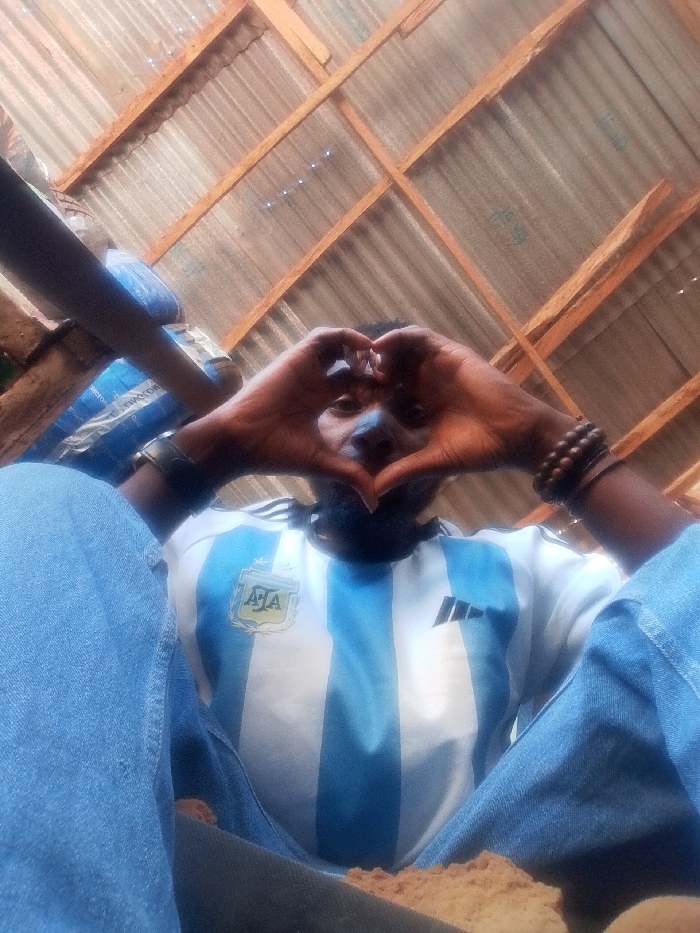 The image displays a low-angle view of an individual seated indoors, performing a heart gesture with their hands. The subject, a person with dark skin, is wearing a light blue and white striped Argentina national football team jersey, identifiable by the AFA (Asociación del Fútbol Argentino) emblem on the left chest. They are also wearing blue denim jeans. A dark watch with a broad strap is visible on the left wrist, and multiple beaded bracelets adorn the right wrist. The hands are positioned in front of the face, creating a heart shape that obscures the upper facial features. In the immediate foreground, between the subject's legs, a quantity of light brown, crumbly material rests on a surface. The background consists of a corrugated metal roof supported by visible wooden rafters arranged in a grid pattern. To the left of the subject, a dark cylindrical object and a partially visible blue sack, possibly bearing the text "VISTON" or similar, are discernible. The scene, consistent with the prompt's context, is presumably located within Jos, Nigeria, though the image itself does not contain specific landmarks or identifiers to confirm this exact geographical location.