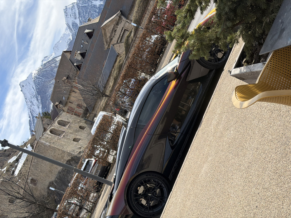 The image depicts a static urban and alpine landscape in Briançon, France, likely within or adjacent to the C Cité Vauban (Upper Town). In the immediate foreground, a luxury sports car is parked on a light brown, granular paved surface. The vehicle exhibits a unique multi-chromatic paint finish, transitioning from dark brown/maroon to vibrant orange/gold hues, with black trim elements. It features black multi-spoke wheels with prominent brake calipers. To the lower right, a portion of a yellow-orange perforated metal chair and green coniferous shrubbery within a planter are visible. The midground features a low, bare-branched hedge running horizontally, behind which a street is implied. Several vehicles are partially obscured by the hedge, including a silver SUV and a silver van or camper. A tall, dark utility pole stands vertically on the left side of the frame. Beyond the street and hedge, a sloped embankment with sparse, dry vegetation and leafless trees ascends towards historical stone architecture. Prominent structures include thick-walled stone buildings with arched window openings and dark-tiled roofs. One building to the right exhibits a distinct classical pediment above an entrance. The background is dominated by majestic, snow-capped mountains under a clear blue sky with scattered white cirrus clouds, indicative of an alpine environment. No people are visible, and no specific actions or interactions are depicted.