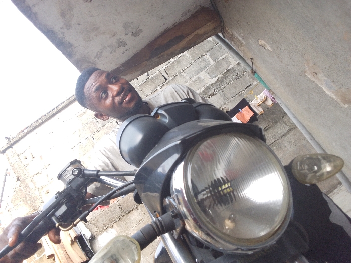 The image displays a male individual and the front of a motorcycle within the city of Alaiyabiagba, Nigeria