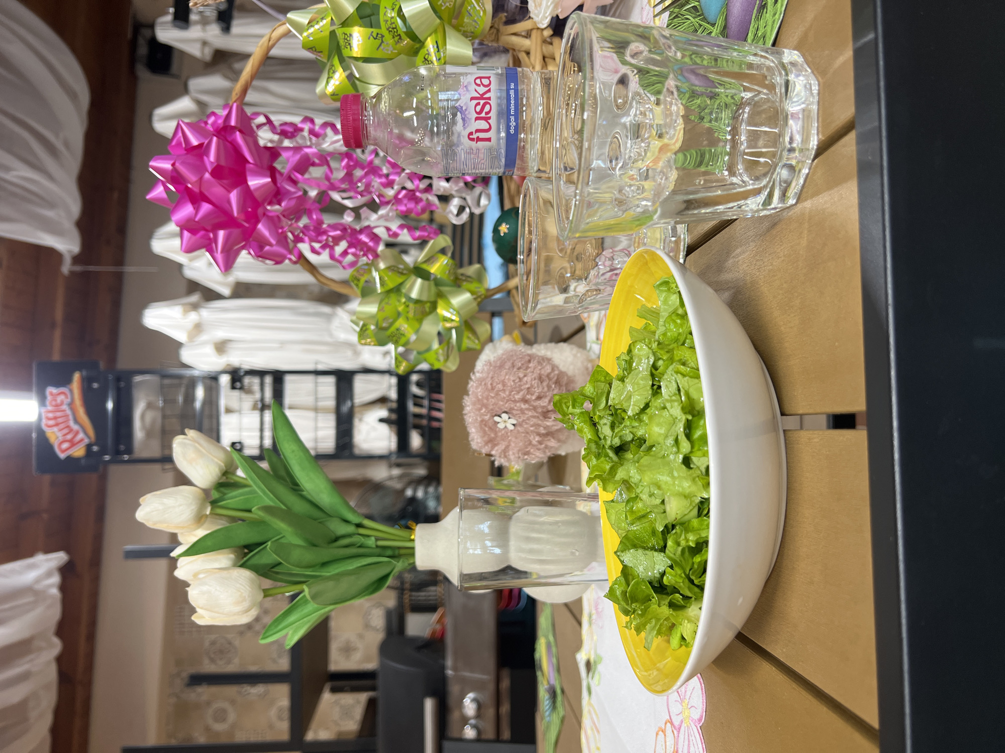 The image depicts a tabletop arrangement featuring a bowl of green salad with a yellow interior rim, a bouquet of white tulips in a clear vase, and several glasses and a bottle of "fuska" mineral water, all situated on a wooden surface. In the background, there's a basket adorned with pink and green ribbons. The setting appears to be indoors, with a glimpse of a room interior and a "Ruffles" sign visible. The location is indicated by the brand of the mineral water, "fuska," suggesting the image was taken in Bulgaria, and given the prompt, specifically in the city of Obzor. The items are arranged for a possible celebratory event or a decorative display. There are no people directly visible in the frame.