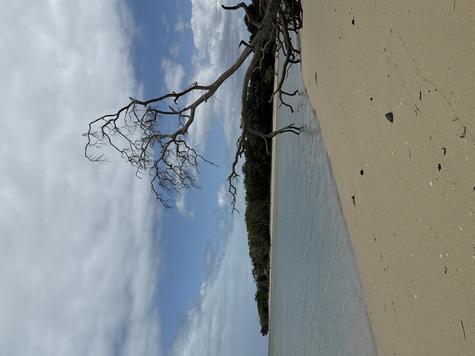 This image presents a coastal scene in Bourail, France. The foreground features a light beige sand beach, sparsely populated with small dark stones, white shell fragments, and scattered natural debris. A prominent, large, leafless deciduous tree dominates the midground, leaning significantly from the right side of the frame towards the left. Its gnarled branches extend upwards and outwards, while its lower branches and roots are partially submerged in the clear, calm, light blue-grey water adjacent to the beach. The water exhibits a smooth surface with minimal ripples. In the background, across the tranquil water, a dense strip of dark green vegetation outlines a distant landmass or island. The sky above is partially obscured by scattered white and grey cumulus clouds, interspersed with areas of clear blue sky. No human figures or active subjects are present within the frame.