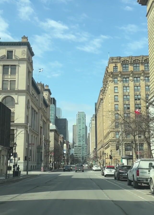 The view from the interior of a vehicle looks down a straight city street lined with tall, architecturally detailed buildings, predominantly tan in color. A few modern, glass skyscrapers are visible in the distance. The sky is bright blue with scattered white clouds. Several cars drive down the street while others are parked along the right side. A single pedestrian walks on the left sidewalk. Traffic lights are visible at intersections, and the Quebec flag flies from one of the buildings on the left.