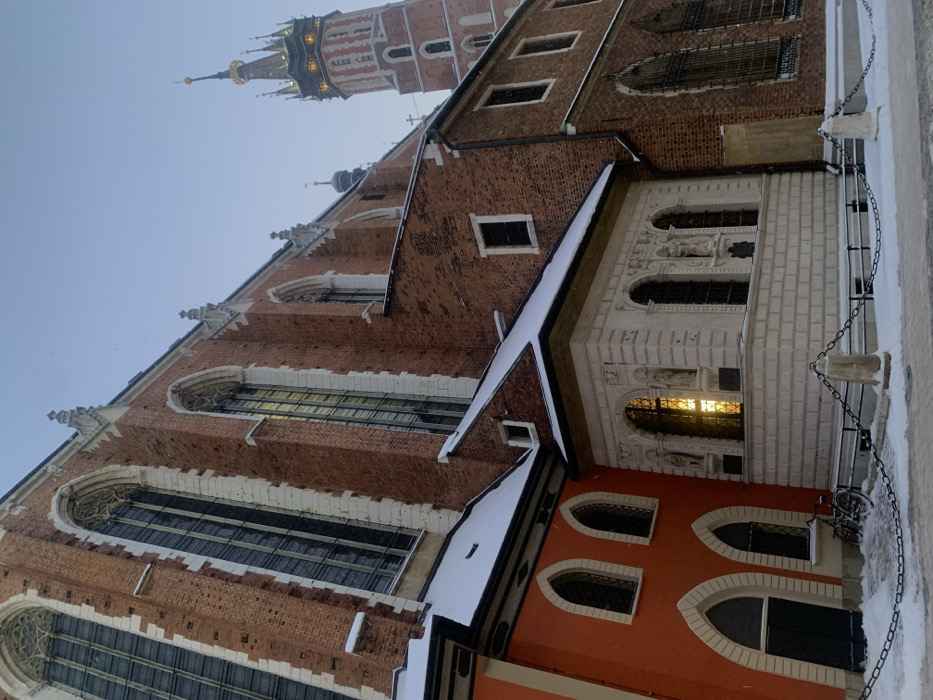 The image displays the exterior of St. Mary's Basilica (Kościół Mariacki) and adjacent structures in Krakow, Poland, under winter conditions with snow cover. The primary subject is the large Gothic church, constructed of red brick with contrasting white stone detailing along its buttresses, window frames, and cornices. Tall, arched windows with dark panes are visible along the church's main wall. The prominent Hejnał Tower, also made of red brick with white accents and an ornate golden spire, rises in the upper right quadrant, its windows illuminated. A smaller, white stone structure, possibly a chapel or sacristy, is attached to the main church building. This structure features ornate carvings, including visible statues and reliefs, and arched windows, one of which emits a warm yellow light. To the left, an adjacent building with a vibrant orange-red facade, complete with arched windows and a dark door, is partially visible. All visible rooftops and ledges on the buildings are covered with a layer of white snow. The ground in the foreground is entirely snow-covered. A dark-colored bicycle is leaning against the orange-red building on the left. A low barrier, consisting of several light-colored stone posts connected by heavy metal chains, extends across the snowy foreground. The sky is overcast and grey, and faint specks consistent with light snowfall are discernible in the air. No people are visible within the scene.