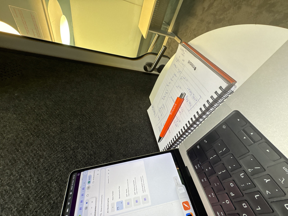 The image displays an indoor workspace in Nes Ziona, Israel. A silver MacBook Pro laptop occupies the left side of a light-colored, curved desk. Its screen shows a Chrome browser interface with "All Bookmarks" and the system time "Wed 15 Oct 13:10." The laptop's keyboard features both English and Hebrew characters. To the right of the laptop, a spiral-bound notebook with white lined paper and an orange spine is open, displaying handwritten notes, a grid, and a "moovit" logo on the lower right of the page. An orange "moovit" branded ballpoint pen rests diagonally across the open notebook. The background immediately behind the laptop and notebook is a dark grey, textured acoustic panel. To the right, a light-colored door frame with a metallic handle is visible, leading into an adjacent area characterized by bright yellow lighting and a light-colored rectangular table. No individuals are present in the scene.