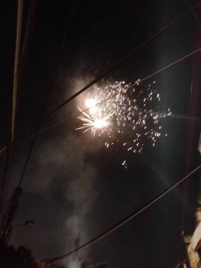 Against a dark night sky, a bright firework explodes. The main burst is a radiant white with distinct rays emanating from a central point. Around the primary explosion, smaller glittering fragments disperse in a semi-circular pattern. Several dark, diagonal power lines run across the scene, adding an urban element. Smoke from the firework fills the lower portion of the frame, partially obscuring dark shapes that suggest buildings or trees.