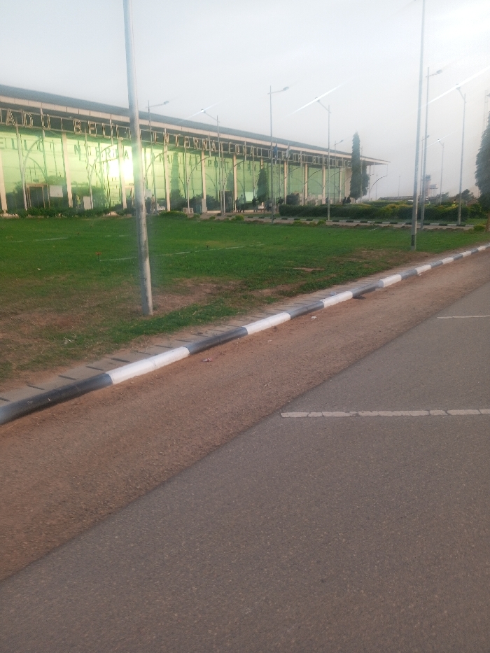 paved road with a white and black curb separating it from a grassy area. In the background, a large building with a glass facade is visible. There are several lamp posts along the side of the road. The image was taken at the Nnamdi Azikiwe International Airport in Abuja, Nigeria. There are no people visible in the image. The sky is overcast and the time of day is likely late afternoon or early evening.