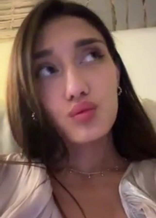 A woman with long, dark hair and light skin is posing for a selfie video. She is wearing a light-colored blouse with a silver necklace. The background includes a slatted blind and a light-colored wall decoration. The woman purses her lips and looks at the camera. She has defined eyebrows and eyeliner. Her earrings are small and circular.