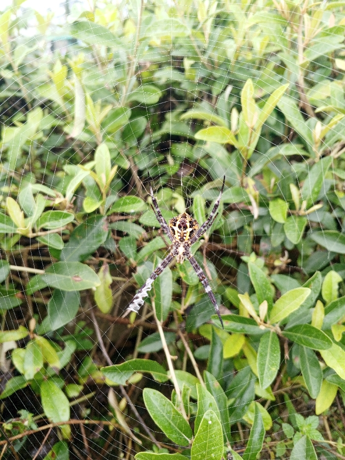 A spider with yellow and black markings rests in the center of its web. The web is strung between green leafy branches of a bush or small tree. The spider has distinctive striped legs, with one pair displaying a white, curly pattern near the end. The background foliage is dense, creating a natural and somewhat blurred backdrop for the spider and its web.