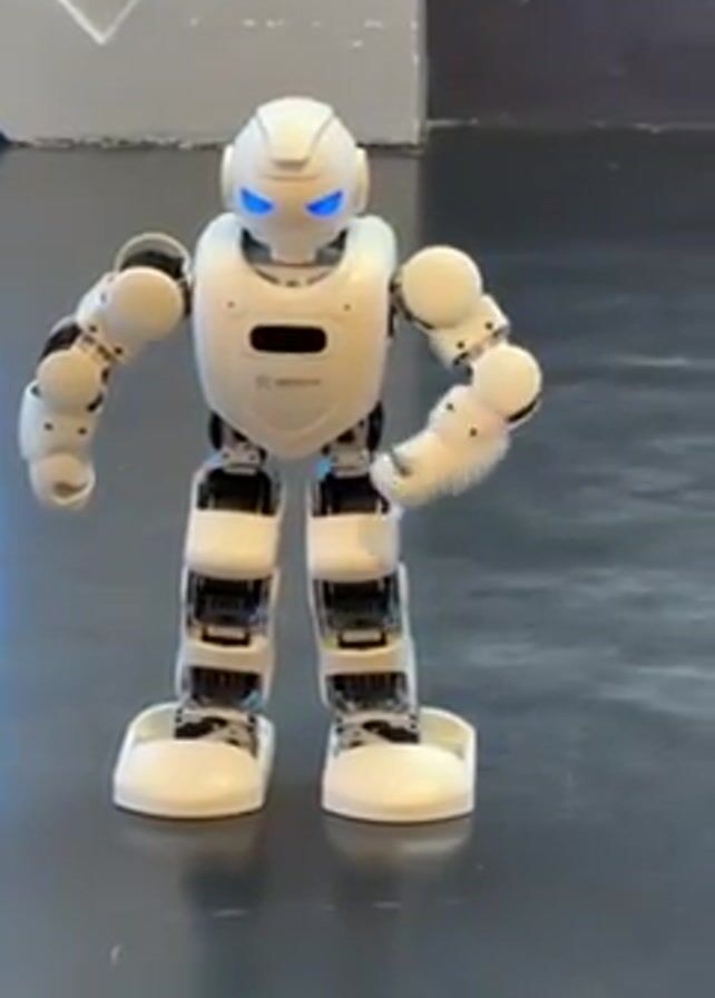 A small white humanoid robot dances in place on a black floor