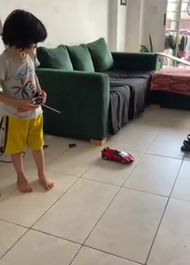 A young boy stands barefoot in a living room controlling a red remote-controlled car