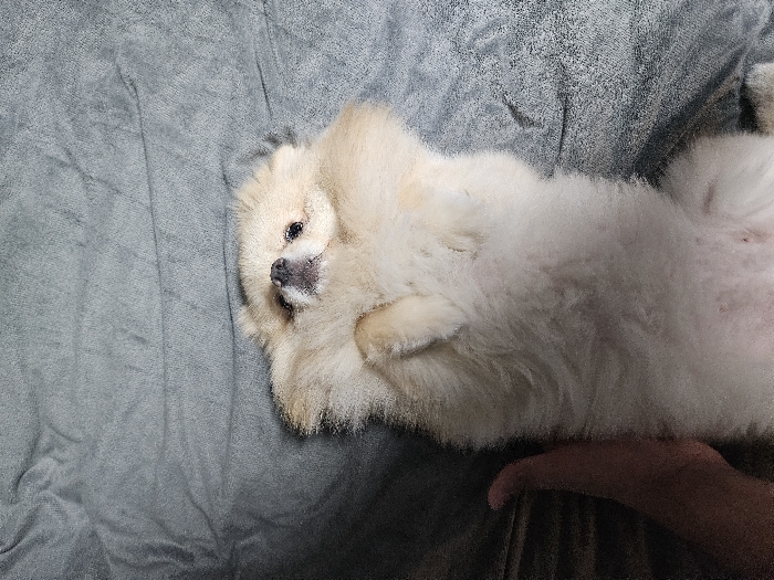 - "The scene in Botevgrad, Bulgaria, depicts a small, cream-colored, fluffy dog, consistent with a Pomeranian, lying on its back on a grey textile surface" by FM-nJ2682, licensed under CC BY 4.0