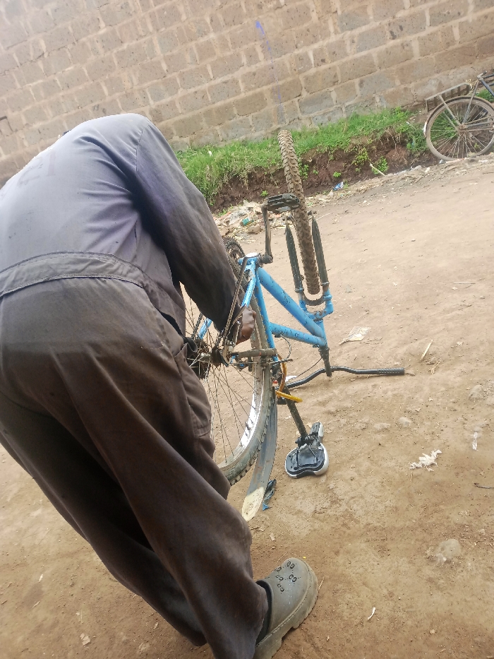 - "A person wearing dark, baggy clothing bends over a blue bicycle that's upside down" by FM-WEceg1, licensed under CC BY 4.0