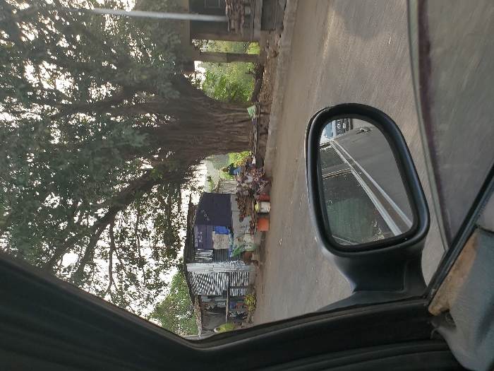 A view from inside a car features a side mirror reflecting a road with a double yellow line. Outside the car, a large tree dominates the scene, casting shade over a small roadside market stall. The stall is cluttered with various items and some orange buckets. The sky is overcast, and the image appears slightly blurry.