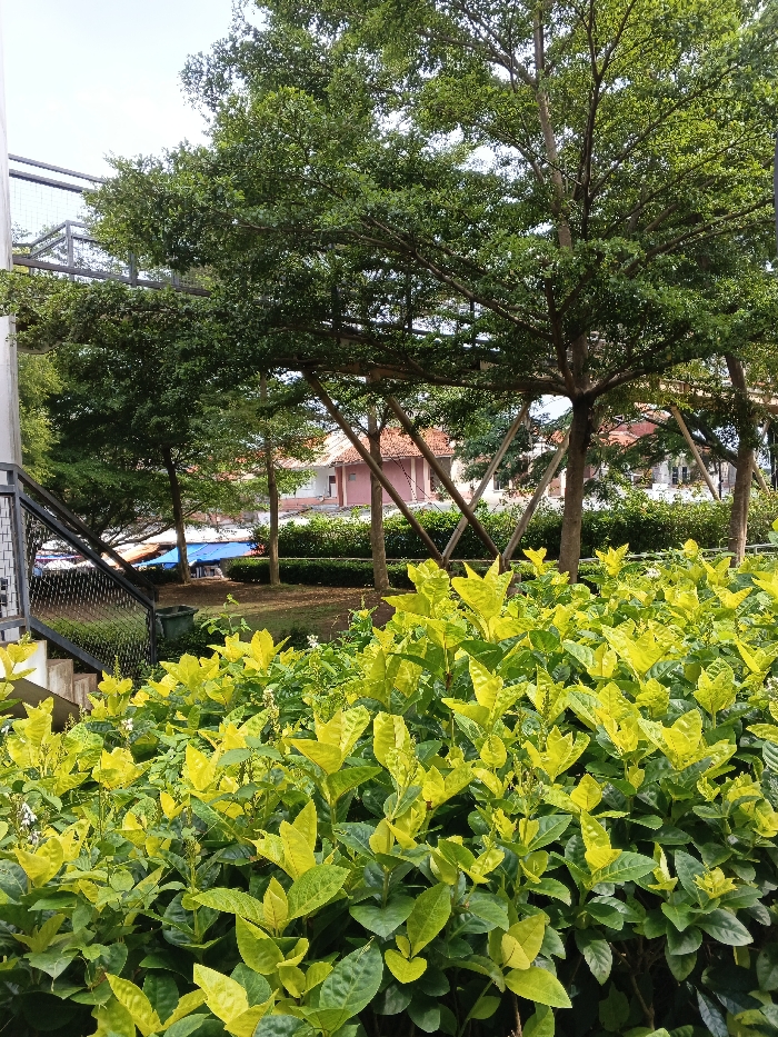 Green bushes dominate the foreground, their vibrant leaves highlighted by the sun. Above, taller trees with leafy branches reach across the scene, some supported by wooden frames. In the background, buildings with reddish rooftops are partially obscured by the trees and greenery. A metal structure is seen on the left near a set of stairs and a green bin, adding a touch of urban elements to the natural setting.