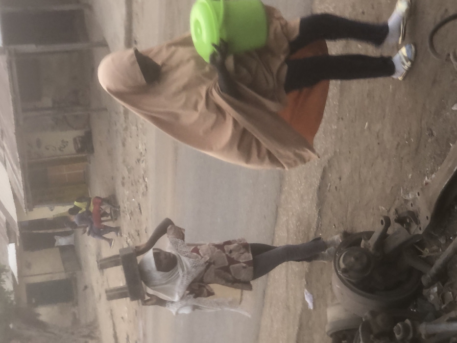Two individuals are depicted in the image. One, wearing a tan hijab and dark trousers, carries a green container on their head. The other individual is seen carrying a load on their head. Several other people are visible in the background, near a building. The foreground contains what appears to be automotive parts.