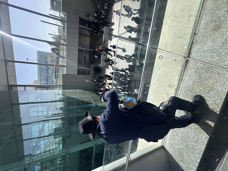 The image depicts an elevated view of a bustling urban plaza in Jerusalem, Israel, specifically near the Jerusalem Navon (Yitzhak Navon) train station and Central Bus Station complex, identified by modern glass architecture, light rail infrastructure, and Hebrew signage including "כניסה" (Entry) and "כל העיר" (Kol Ha'ir) on a distant building. In the foreground, a male individual, viewed from behind, stands leaning against a glass and metal railing. He is dressed in a dark suit jacket, dark trousers, and a black fedora hat, with visible peyos (sidelocks) indicating Orthodox Jewish attire. He holds a partially open bag of potato chips or similar snacks in his hands. Below, a large crowd of people, predominantly young males dressed in dark suits, white shirts, and black hats, consistent with Haredi (ultra-Orthodox) Jewish dress, gathers on a paved concourse. They are congregated in an open area, some appearing to be moving, others standing. Barriers or barricades are visible within the crowd. Several individuals in what appear to be safety vests (one orange) are present among the crowd, possibly security or event staff. The environment features modern glass-paneled buildings, concrete or stone flooring, and metal structural elements. Bright daylight casts strong shadows across the plaza. In the background, other urban buildings, overhead lines consistent with light rail, and a clear blue sky are visible.