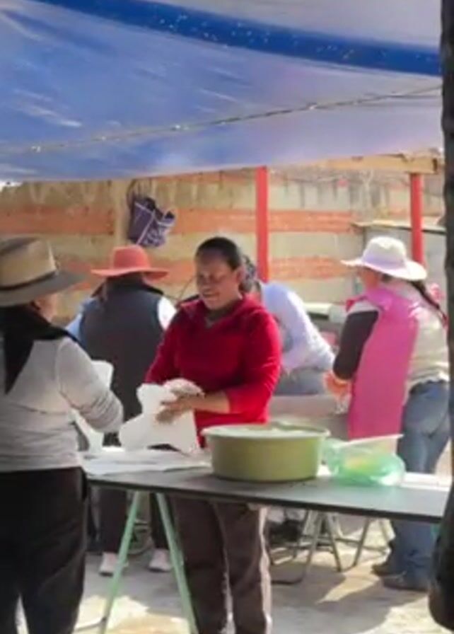 Under a blue tarp, a group of people are working around tables. One woman in a red jacket is handing out white paper squares to another woman wearing a gray shirt and a hat. A large green bowl sits on the table in front of the woman in red. Behind them, other people are gathered around another table, interacting with what appears to be food preparation. The setting appears to be outdoors, with a brick wall visible in the background.