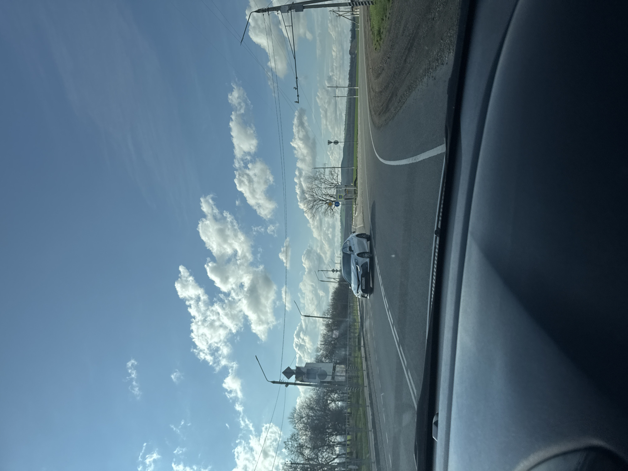 A photo taken from inside a car shows a view of a road with a silver car driving on it. On the left side of the road, there are trees and power lines. The sky is blue with white clouds. The location appears to be Otradnaya, Russia based on the presence of roadside infrastructure and the overall landscape.