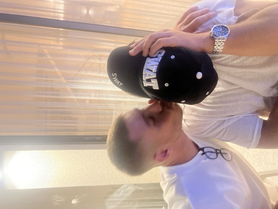 two individuals in an intimate embrace within an indoor setting. The person on the left, with short, light-colored hair and wearing a white short-sleeved shirt, is leaning in to kiss the cheek of the person on the right. A pair of black-framed eyeglasses hangs from the collar of the left individual's shirt. The person on the right wears a white short-sleeved shirt and a black baseball cap backward, which obscures their face. The cap has "SWAT" embroidered on its front, appearing inverted from the viewer's perspective, and "SWAT" embroidered horizontally on the rear panel. The right individual's left hand is positioned near the brim of their cap, and a metallic watch with a dark circular face and a link bracelet is visible on their left wrist. The background features a light-colored, textured wall on the left, with a bright light source illuminating the upper section. To the right, a large window or glass door is visible, covered by light-colored, sheer vertical blinds or curtains. The specific location within Rishon LeZion, Israel, cannot be determined from the visual information provided; the scene is an indoor domestic or commercial space.
