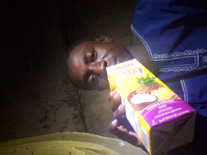 A person lies on their side in a dimly lit area, holding a juice box. The juice box is brightly colored with images of pineapple and coconut, and its label appears to say "Crivito." The individual wears a blue shirt with a patterned trim. The setting appears to be indoors, with a textured wall and a yellow mesh-like material visible in the lower part of the frame.