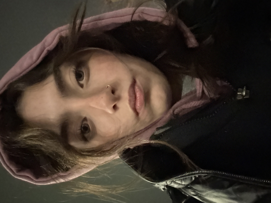 A young woman with brown hair and light skin wears a pink hoodie and a black jacket. She gazes directly at the camera, her expression is calm. She has a nose ring and her lips are subtly pink. The image is slightly tilted, and the lighting appears to be from an ambient source, possibly at night. The focus is sharp on her face.