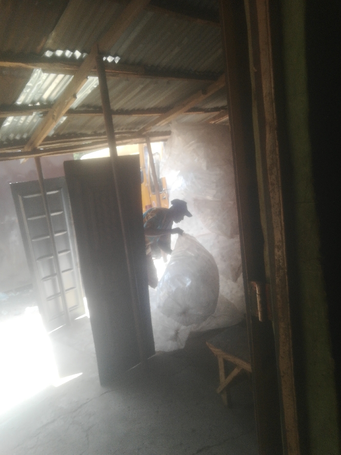 The image depicts an indoor industrial or storage environment located in Zaria, Nigeria. A dark-skinned individual, wearing a patterned garment and a dark baseball cap, is positioned in the center-right, actively handling a large, white, translucent bag. This bag appears to contain light, possibly granular or fibrous material, and is part of a larger stack of similar bags extending into the background on the right. Behind the bags, a portion of a yellow industrial vehicle or machinery is visible. To the left, strong natural light enters the space, illuminating the concrete floor which exhibits visible cracks. Two dark wooden panel doors are propped upright near the light source, one featuring multiple rectangular recessed panels. The ceiling consists of corrugated metal sheets supported by a network of rough-hewn wooden beams. A wooden stool or small bench is partially visible on the far right. The overall atmosphere appears hazy, possibly due to dust or ambient conditions within the space. A dark, vertical structure, likely a door frame or wall edge, borders the right side of the frame.