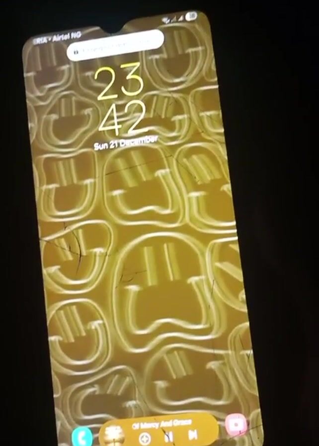 A close-up shot of a mobile phone against a black background displays its home screen. The screen features a background image of yellow smiley faces. The time displayed on the screen is 23:42, and the date is Sunday, December 31st. At the bottom of the screen, a media player is visible, playing a song titled "Mercy and Grace". The phone is tilted slightly, and the camera angle is low, looking up at the device.