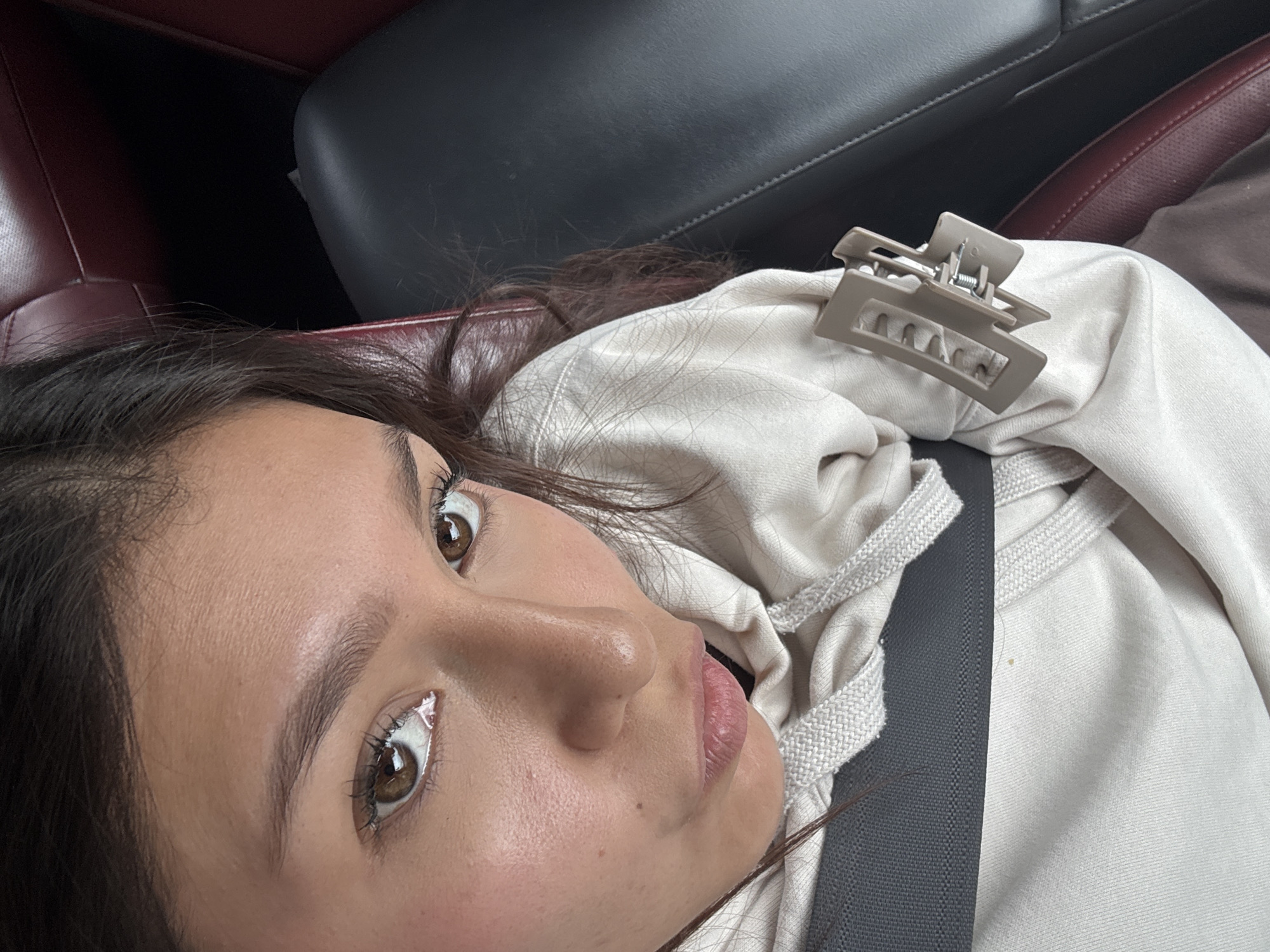 A young woman with brown eyes and dark hair is looking at the camera. She is wearing a light-colored hoodie and a hair clip is attached to the hood near her shoulder. She is wearing a seatbelt in what appears to be the passenger seat of a vehicle. The seats of the car are a dark color. The location is in the city of Santiago Tenango, Mexico.