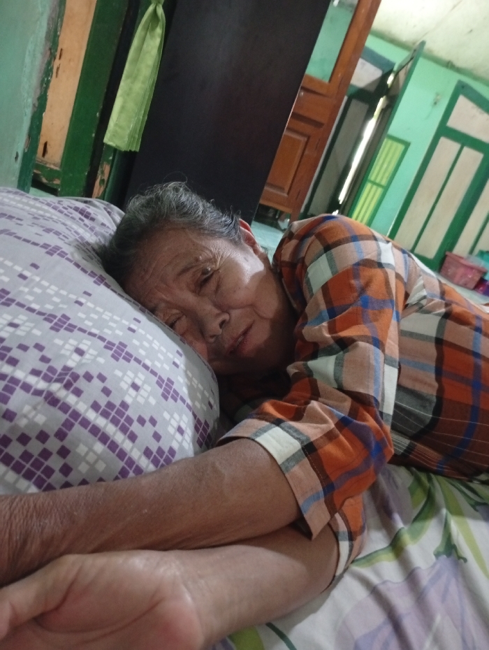 An elderly woman rests on a patterned pillow and bedsheet. She wears a plaid shirt in orange and white tones. Her eyes are closed, and her head is turned towards the left. The background includes a dark cabinet, a wooden door, and a green-painted interior wall. The scene appears to be a bedroom setting.