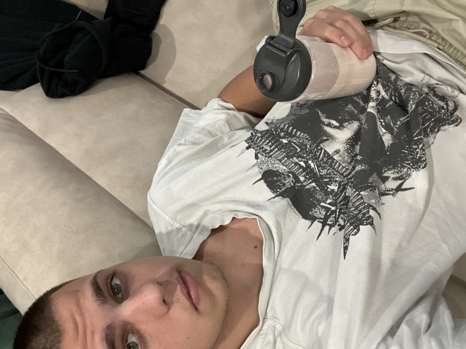 A young male with a buzz cut and light-colored eyes is depicted in a close-up, chest-up shot, reclining on a light beige upholstered sofa in an indoor domestic setting located in the city of Sofia, Bulgaria. He is wearing a light-colored t-shirt with a prominent black graphic print featuring a thorny crown design and a partial face. His right hand holds a clear plastic shaker bottle with a black lid, containing a light pinkish-beige liquid. A crumpled pile of black fabric is visible on the sofa to his upper right. He looks directly forward with a neutral expression.