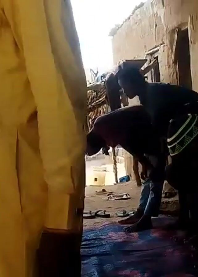 A group of people, predominantly men and boys, are participating in what appears to be a Muslim prayer. They are lined up on a blue rug, some bending in a bowing position while others are standing upright. The individuals are dressed in a variety of clothing, including traditional Islamic attire. They are positioned against a weathered wall under a partially shaded shelter. In the background, an outdoor setting with basic rural structures and vegetation is visible. The camera is positioned close to a person wearing a long yellow robe, partially obscuring the view of the prayer participants.