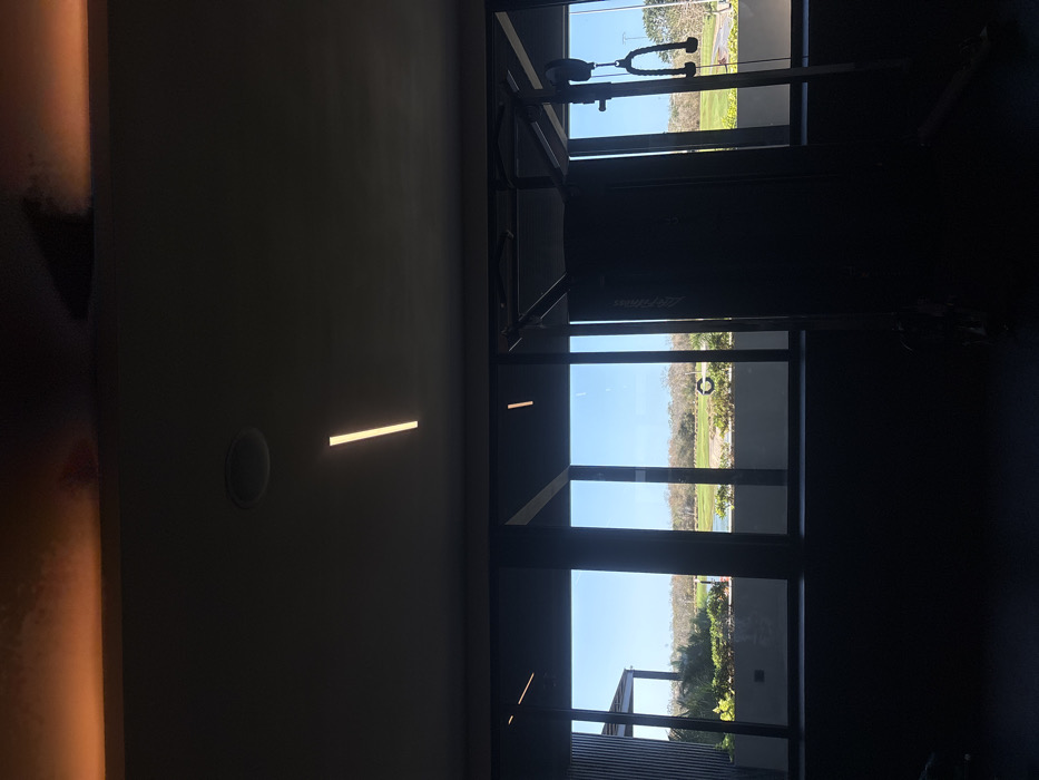 The scene depicts the interior of a facility, likely a gymnasium or fitness center, located in Komchén, Mexico, with a panoramic view through large windows to an outdoor environment. The interior is dimly lit. The ceiling is dark grey, featuring two illuminated linear light fixtures and a recessed circular fixture, possibly a speaker or another light. A faint, reddish-orange glow is present along the top edge of the ceiling, possibly a reflection or architectural accent lighting. No individuals are present. To the right, a large, dark-colored multi-station cable exercise machine is visible in silhouette, partially obscuring the view through the windows. The brand "Life Fitness" is discernible on its side. Cable attachments, including a rope handle, hang from the machine. The floor and lower walls are dark and largely featureless due to shadowing. Through the multi-pane windows, a bright, clear blue sky is visible. The exterior landscape features a body of water in the middle ground, reflecting the sky. Beyond the water, an extensive, manicured grassy area, characteristic of a golf course, stretches into the distance, interspersed with trees and shrubs under a clear sky. In the immediate foreground outside the windows, a landscaped area with green foliage and a low concrete wall is visible. To the far left, an architectural structure with vertical slatted panels is partially seen. A white circular object with a vertical line, possibly a sign or marker, is visible on the grassy terrain in the mid-ground. No human activity or movement is observed in the exterior scene.
