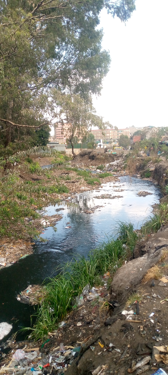 This image depicts a highly polluted river or stream winding through an urban-fringe environment in Thika Township ward, Kenya